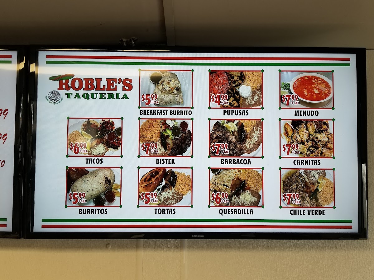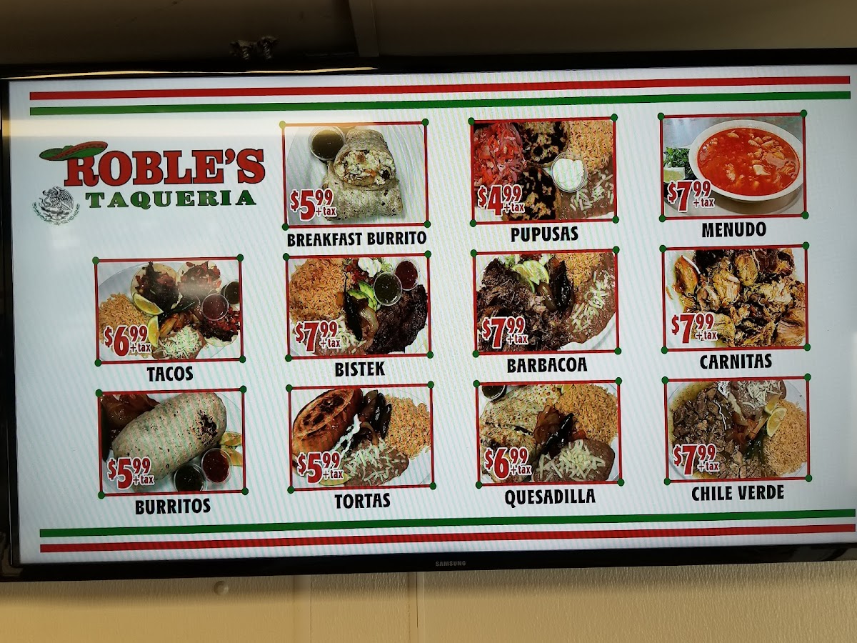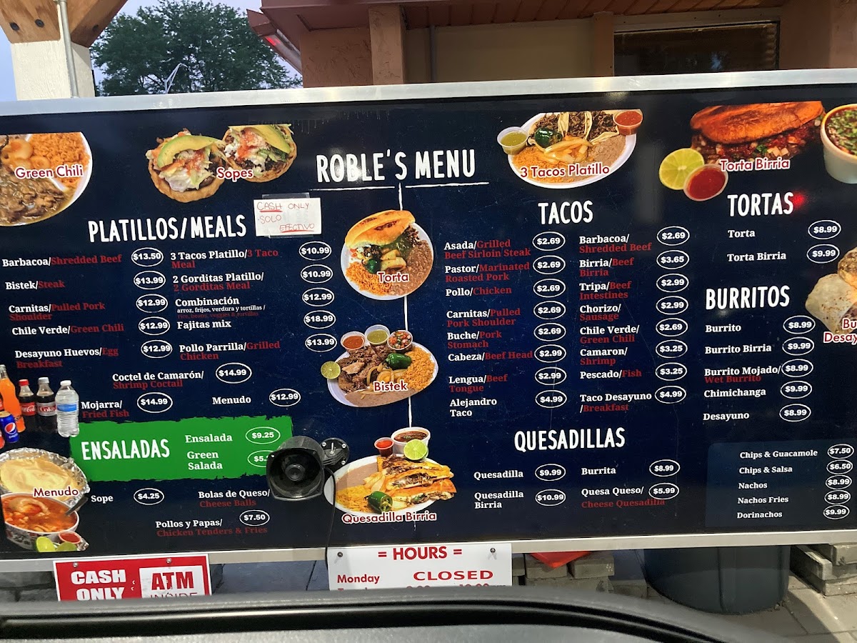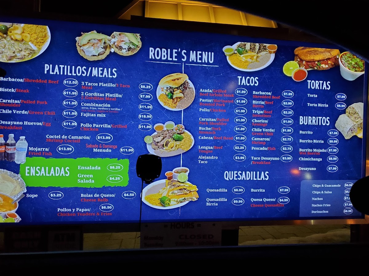 The menu at Roble's Taqueria features a variety of Mexican fast food options, organized to accommodate quick service and casual dining. The selection includes several categories covering tacos, tortas, salads, snacks, and traditional Mexican dishes.