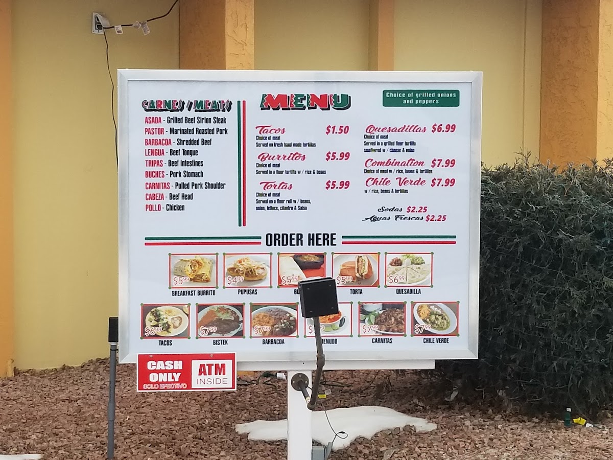 Tacos and Platillos: This section offers a range of taco options such as Birria Tacos, Steak Tacos, Al Pastor, Asada Taco, Taco Carnitas, Tacos Asada, and Barbacoa Tacos platillo. There are also specialty items like Gorditas de Pastor and the 3 Tacos Platillo, featuring diverse fillings including fried fish, buche, cabeza, tripa, and lengua.